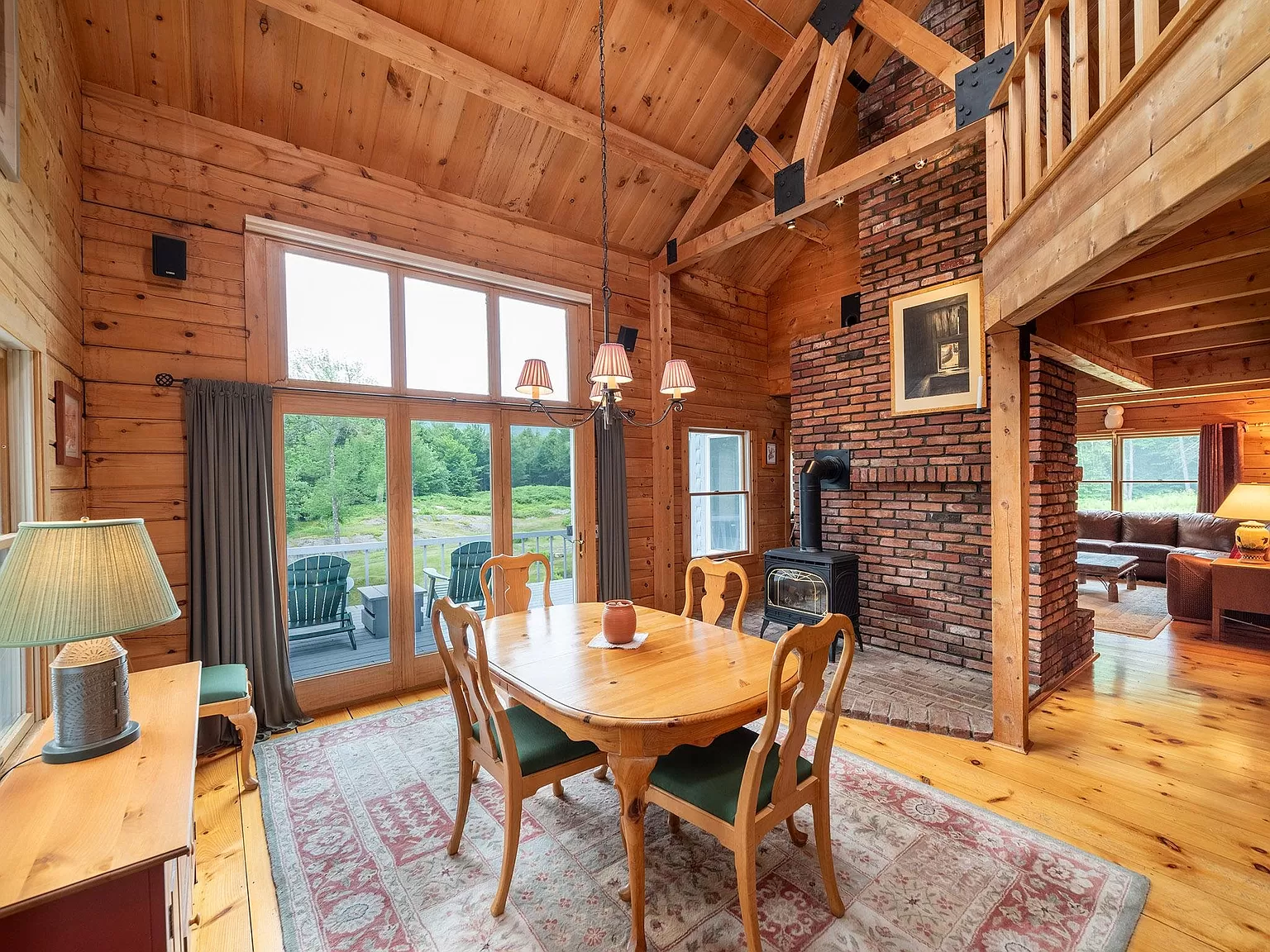 Sunlight pours in to this charming log home in Windham. It is exceptionally well sited to take advantage of the landscape, exposure and view. Many large south facing windows allow for ample light inside and the large deck that surrounds the home extends the living space to outside.